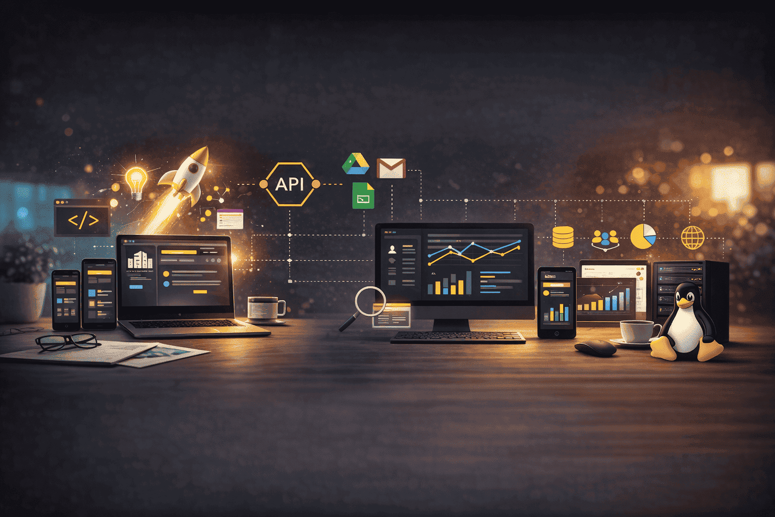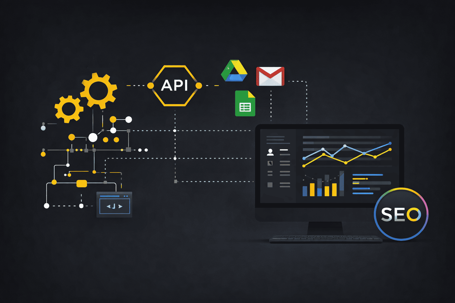 Otomatisasi proses bisnis, integrasi API, Google Workspace automation, serta optimasi SEO teknis dan konten untuk meningkatkan efisiensi digital.
